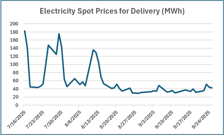 This plot represents electricity spot prices for delivery (MWh) according to EIA data. The daily price action from July to the present is the most volatile of the four choices, but two other markets are not far off. The average from mid July is $61.33/MWh. The low was $28.29/MWh and the high was $183.23/MWh. It does not own the distinction of having the highest natural gas prices for spot delivery over this timeline. It takes second place by a margin of 29 cents per mmbtu. Do you know it?